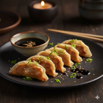 (x70)Savor the rich flavors of perfectly pan-fried chicken gyoza, enhanced by a classic, savory soya dressing