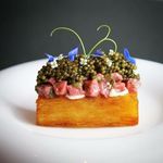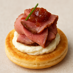 (x70)Succulent steak served on a fluffy pancake, accented with a zesty jam and radish touch