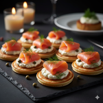 (x70)Delicious smoked salmon and creamy cream cheese artfully presented on mini salted pancakes for a perfect blend of flavors