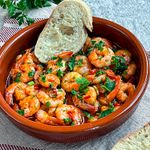 (x70)Succulent mini prawns sizzling in a classic Pil-Pil garlic and chili oil, served with fresh, absorbent bread for dipping
