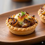 (x70)A classic savory miniature tart featuring sweet, slow-cooked caramelized onions baked into a flaky pastry crust
