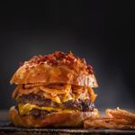 (x10)A juicy mini smash burger featuring a thin, crispy-edged beef patty topped with melted cheese, caramelized onions, and crunchy bacon.