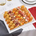 (x1)- Bruschetta with Parma ham and brie cheese, 30 g, 5 pcs. - Bruschetta with shrimp in unagi sauce and avocado paste, 40 g, 5 pcs. - Bruschetta with roast beef, goat cheese and honey mustard sauce, 33 g, 5 pcs. - Bruschetta with caponata made from bell pepper, orange and nuts, 35 g, 5 pcs. - Bruschetta with salmon, ginger-lime cream and raspberry topping, 30 g, 5 pcs.
